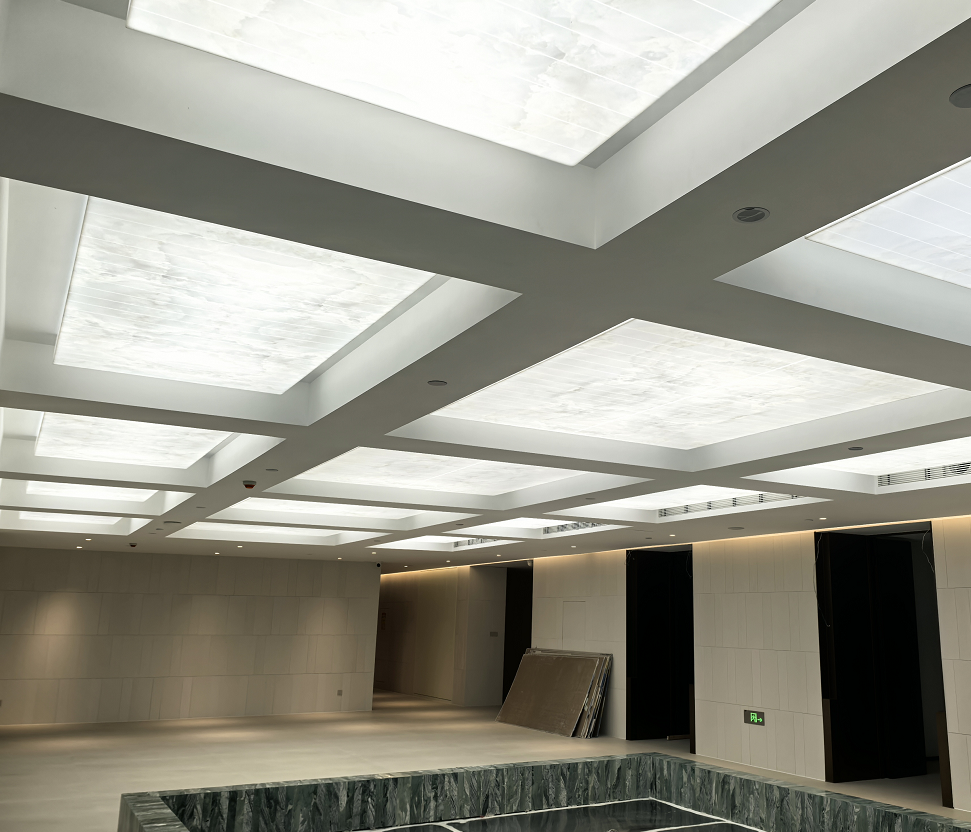 大堂核心区域:透光云石亚克力板成为首选——通过无缝热压工艺还原天然云石的纹理肌理,搭配内置暖光系统,打造出媲美天然石材的温润质感,用作前台背景墙、立柱包边或挑空吊顶时,既能通过光线漫射营造恢弘大气的视觉效果,又比天然云石更轻便、不易碎裂,运输与安装成本降低40%以上;针对主题酒店,还可定制渐变透光云石板,配合灯光切换呈现不同色调,强化主题氛围。