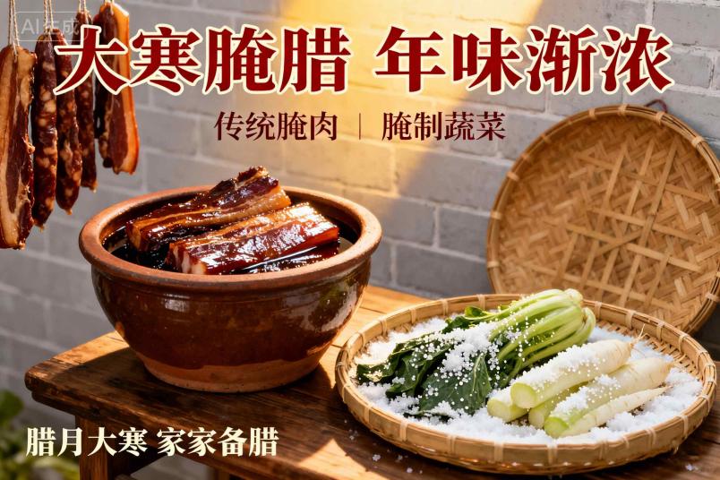 腌肉腌菜:北方有 “小寒大寒,杀猪过年” 的俗语,家家户户开始腌制腊肉、腊肠,南方则喜腌渍白菜、萝卜,为春节储备年味。