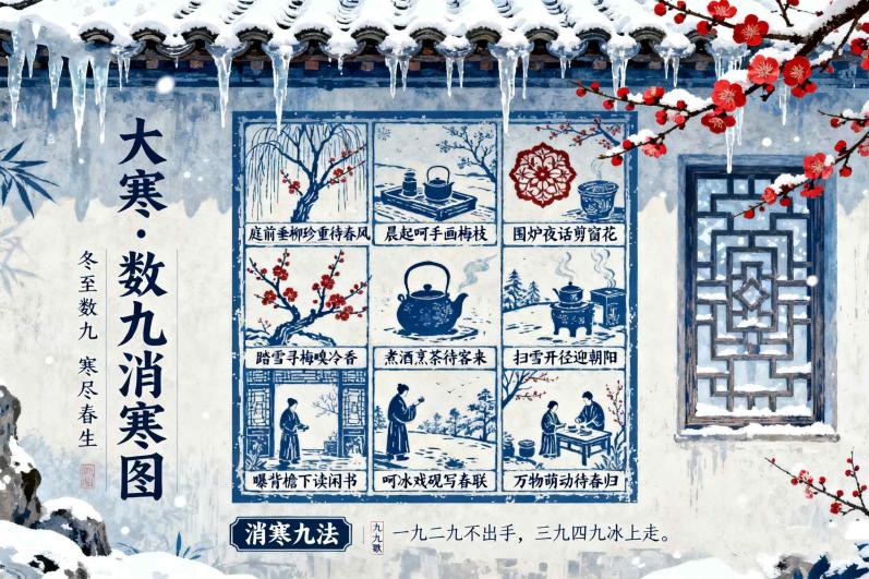 数九消寒:此时正值 “四九” 或 “五九”,人们通过画 “九九消寒图”、喝消寒粥(如腊八粥)等方式,期盼寒冬早日过去。