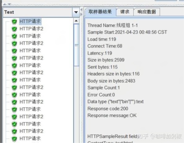取样器结果如下图,请求栏有请求头和请求数据,响应数据栏有响应头和响应数据。