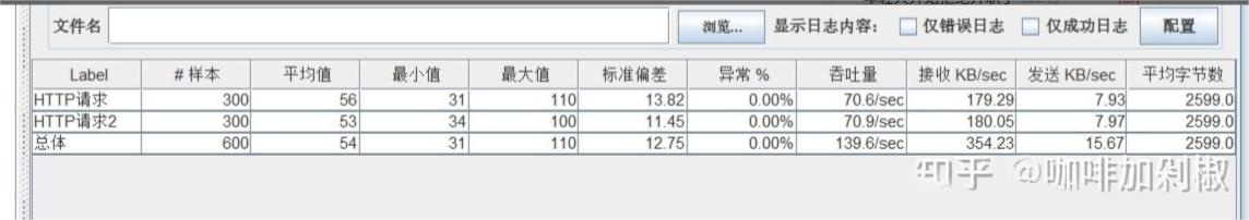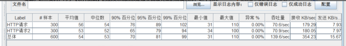 这里可以看到每个请求以及总体的各项指标,我们要关注的是异常百分比和吞吐量,异常百分比越大,性能就越差,吞吐量越大效率越高