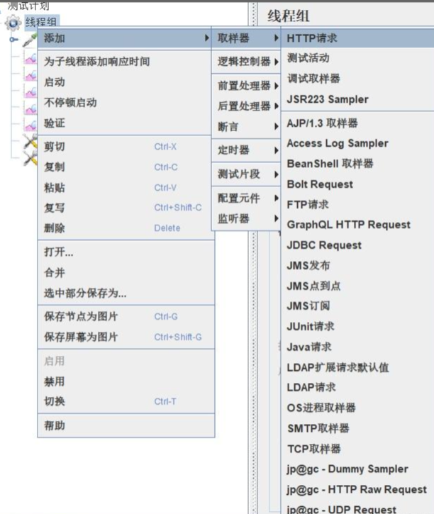 点击选中线程组,右键添加取样器输入协议