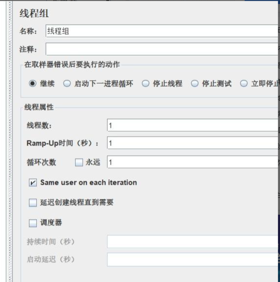 点击线程组,这里可以设置名称,添加注释,设置线程数(每次有多少线程同时开启)、线程响应时间(多少秒完成线程)、循环次数(每个线程数需要开启几次)等