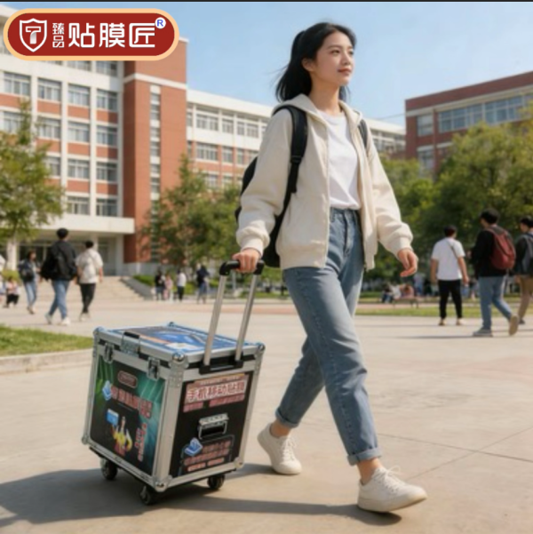 作为中鑫时代科技专为副业创业者打造的利器,臻品贴膜匠移动智能贴膜箱颠覆了传统贴膜的运营逻辑,以“便携+智能”两大核心优势,完美契合业余创业的需求。它不像传统智能贴膜机那样占地广阔,而是设计成可轻松收纳、手提便携的箱体形态,重量轻便,上班族下班后可拎去夜市、社区,大学生可带到食堂门口、宿舍楼旁,宝妈也能推着婴儿车顺带出摊,真正实现“哪里有人气,就去哪里”。